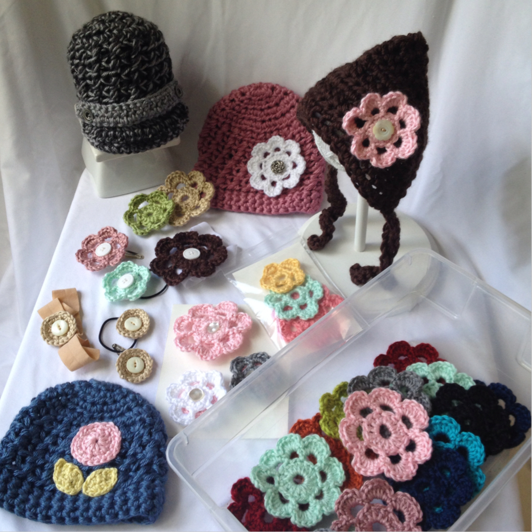 The idea is to have all kinds of hats and hair accessories with interchangeable flowers in lots of different colors.  Obviously its not really hat season right now, but they are so fun to make that I can’t help myself!  I clearly have a crochet addiction.